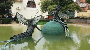 A városi hídfőnél, a medencében álló színes gömb felületére került elhelyezésre Varga Gábor szobrász ……………………………………………………………. nevezetű szobra. |