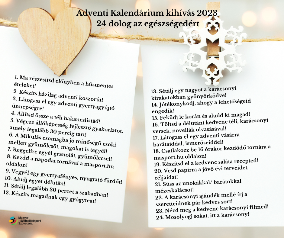 Megérkezett a december, elszaladt ez az év is, elkezdődött a visszaszámlálás. Mától az adventi kalendáriumok kis ablakainak kinyitásával kerülünk napról napra közelebb karácsonyhoz, de az év végéhez is. A karácsonyi ünnepkör sok programmal, néphagyománnyal köszönt ránk, így idén Luca napján kedveskedünk egy speciális tornanappal. Mivel a néphagyomány dologtiltó napként tarja számon december 13-át, mi fordítsuk ezt a „szabad napot” az egészségünkre, mozogjuk a Mozgásélmény szenioroknak Program oktatóinak óráira.